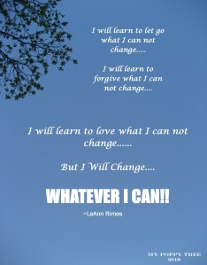 The words on this photo are from LeAnn Rimes. Her song: What I can not change is a wonderful song. I would encourage you to take the time to listen to it. Close your eyes and feel the message, letting the words sink into your soul saying: I will learn to let go what I can not change. I will learn to forgive what I can not change. I will learn to love what I can not change, but I will change whatever I can!
