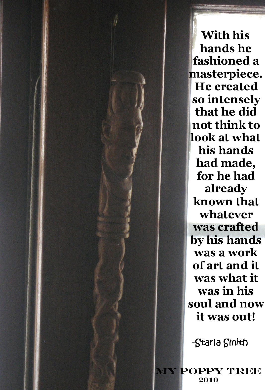 I have talked about Poppy before…wonderful artist. This picture is of a cane that he created. This particular cane he gave to my husband. Everyone enjoys to see the cane …the details of the face…the rope work on the bottom-not shown in pic..sorry:0(