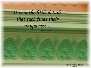 This photo is from a trip that my Grammy and I took around Iowa on the scenic route. We saw a lot of wonderful sights. This detailed crown molding reminds me of how a crafter will build his house adding the details to make it unique. We all are also unique. Our details make us special. All those quirks and talents….that tattoo or maybe a mole. Our eyes and the viewpoint from where we are sitting …all these things make us the unique creations that we are. Celebrate these differences today…. today let them be a blessing, a reason to smile. :0)