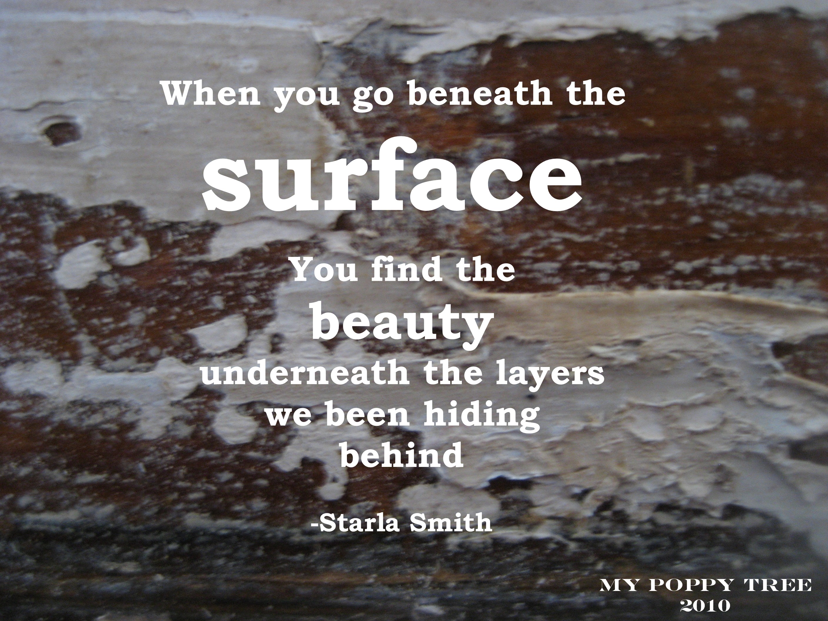 This picture is of my basement door in the process of being refinished. I encourage you to go beneath the surface of your life. Go deeper than the usually ” I’m fine” or ” Nothing much”….go deeper to what is really going on in your life. Find someone who will hold you accountable…who will tell you the truth…who will not stand by and watch you lie to yourself. These are the people who go deeper who go beneath the surface and touch the heart and soul of you. Be that for someone else….it helps you grow too. ;0)