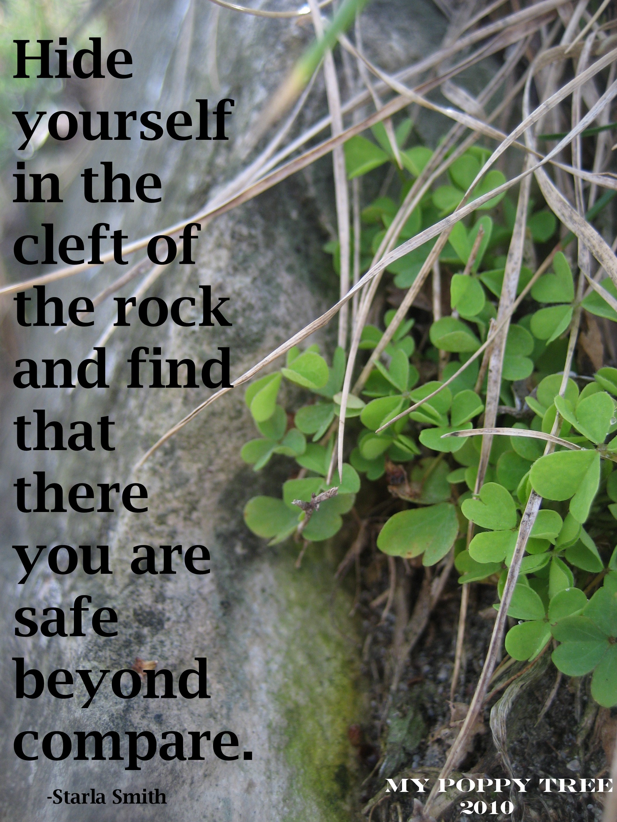 Photoquote Photoquote #18 Posted by Starla on April 13, 2010April 28, 2010 Find that place …that cleft rock place …where you are safe…and YOU KNOW IT!! Share this: Click to email a link to a friend (Opens in new window) Email Click to share on Facebook (Opens in new window) Facebook Click to print (Opens in new window) Print Click to share on X (Opens in new window) X Click to share on Pinterest (Opens in new window) Pinterest Like Loading...