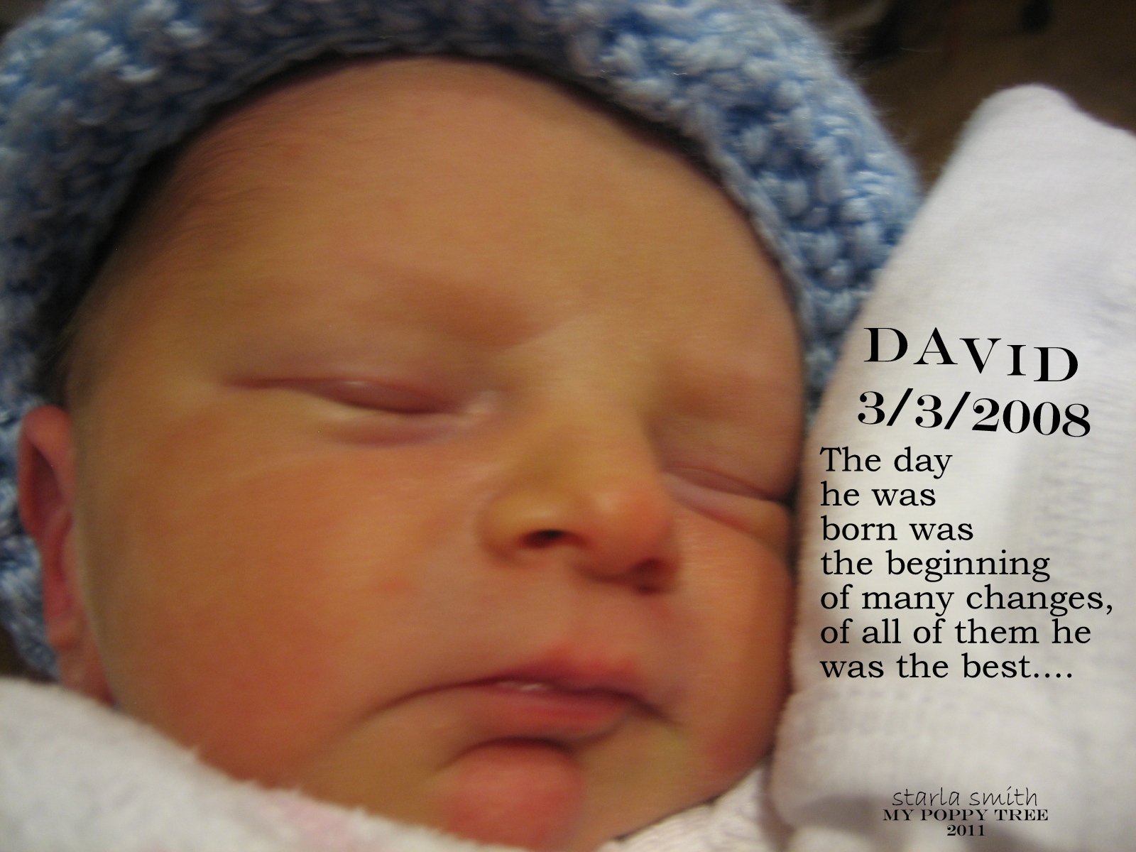 David was born on March 3rd 2008. He came a month early!!!! My water broke and I was standing there with my mouth hanging open and a bit embarrased….like I was peeing on the floor:0)