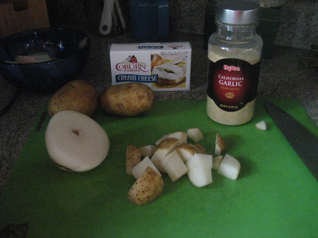 Combine first 4 ingredients in your crock pot, cook on low for 8 hours or on high for 5. Purée soup in food processor with cream cheese. Serve warm topped with bacon, sour cream, shredded cheese & chives.