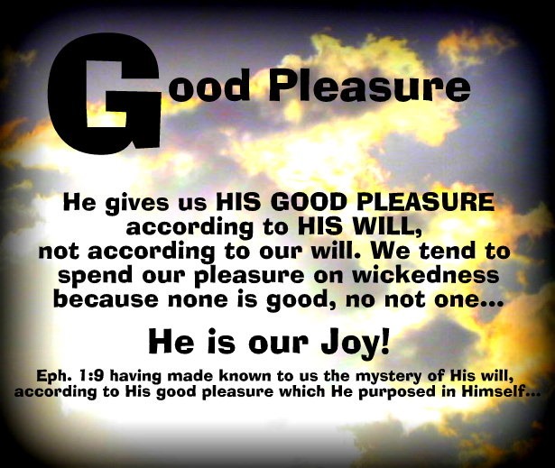 Good pleasure – is when we enjoy what He has given us. A flicker of light that said to your heart God is here. A wild turkey with his feathers all spread that caused you to catch your breath because of the beauty. A moment when you just felt like God was looking right at you. Sometimes these Good pleasure moments awaken a space in your heart to reach for something you long for, like the time I was watching a singer on stage, I witness his passion for singing to the Lord and it made my heart leap. Those are grace moments of good pleasure. They make you say WOW!