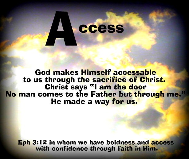 Access – If we know Him there is nothing to fear. We may mess up, lose hope, fall daily and sin. We can come to Him anytime. Good, bad or ugly His love never ends and in his grace he accepts us and invited us in.