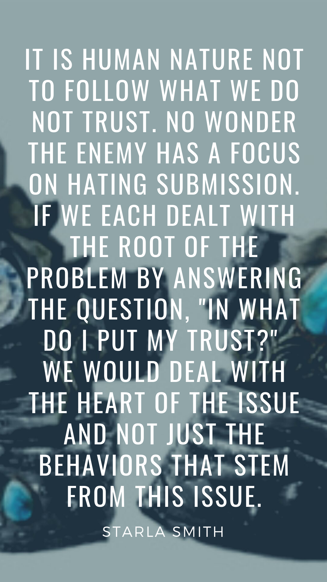 The longer that I am a Christian, the more I understand that submission is a trust issue. I am not talking about trust as in “trusting people” here. I mean where do we ultimately put our trust. If we have no God, or worse, we don’t believe that God is good then we do not trust Him.