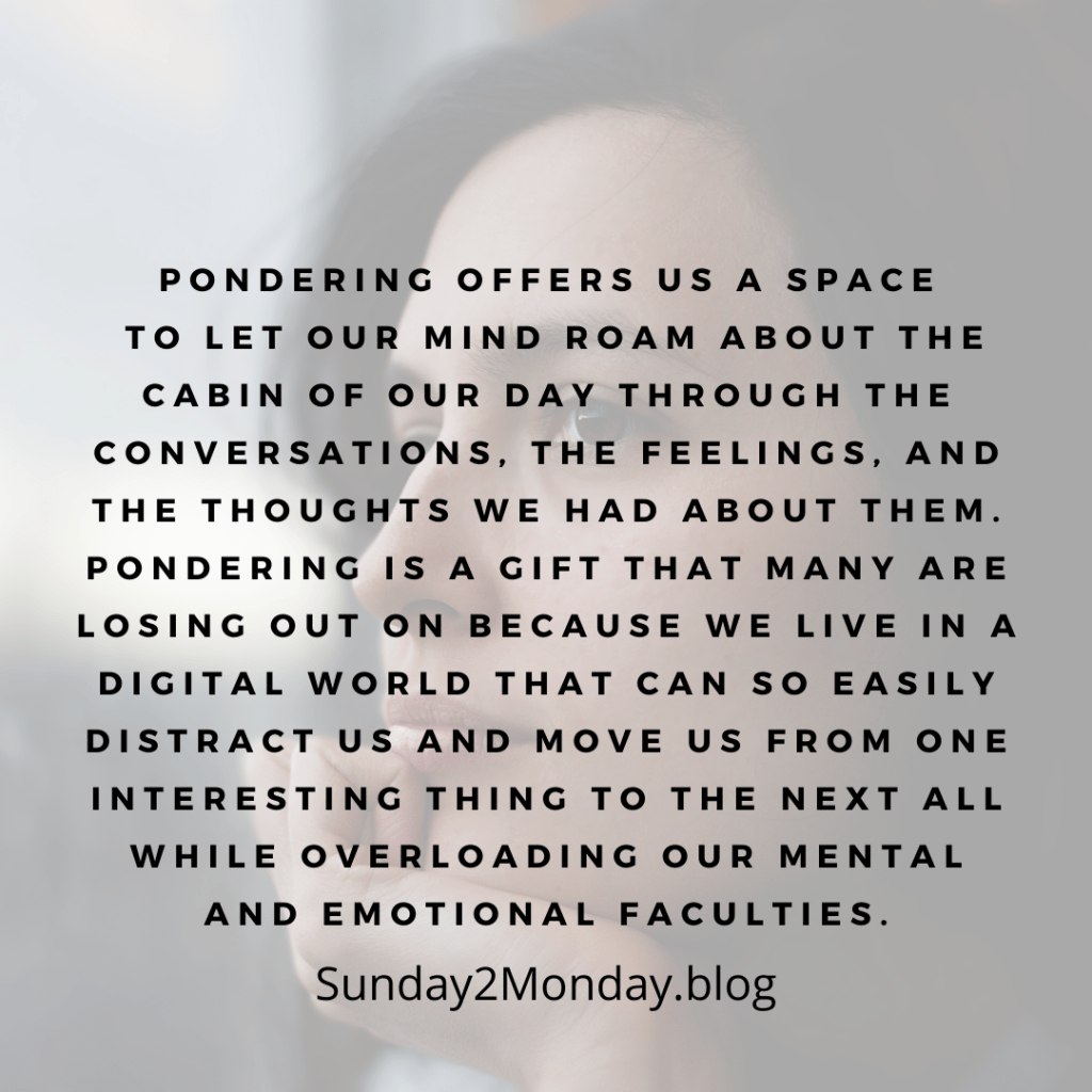 Pondering offers us a space to let our mind roam about the cabin of our day through the conversations, the feelings, and the thoughts we had about them. Pondering is a gift that many are losing out on because we live in a digital world that can so easily distract us and move us from one interesting thing to the next all while overloading our mental and emotional faculties. Last night I woke up somewhere around 2 am and my mind was roaming through the day, so much so, that I ended up writing in my journal.