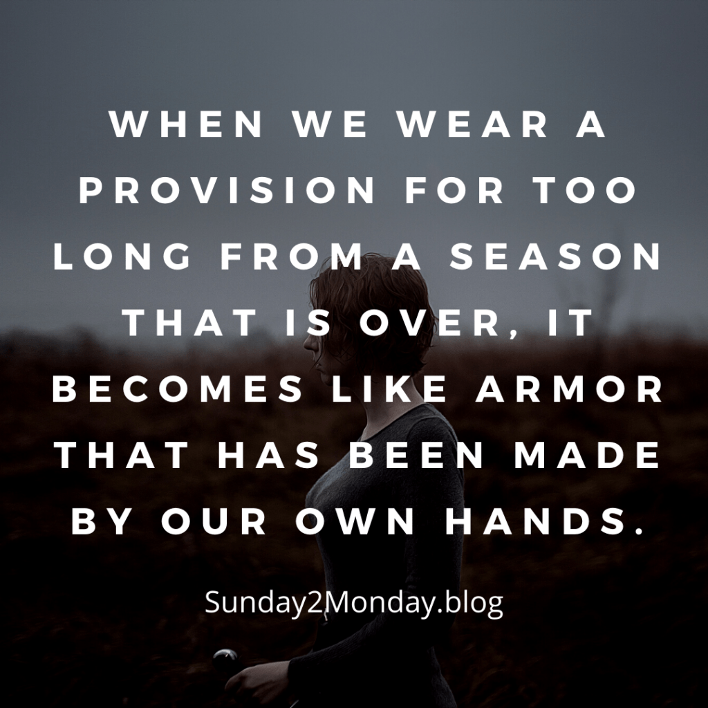 When we wear a provision for too long from a season that is over, it becomes like armor that has been made by our own hands. What I mean by that is when the provision of God is lifted then the armor no longer has His grace upon and it simply becomes a garment we wear. It not longer protects it destroys. It only wields self-power. David, just a shepherd boy, knew not to go out on the battlefield with the wrong kind of armor. If he wore King Saul’s armor it would not fit him and it would be a heavy burden instead. That is what it feels like when you wear armor that had been given as a gift for a particular season for too long. It just doesn’t fit well anymore and it becomes a burden to you and to those around you. That armor suddenly doesn’t serve you as well. It doesn’t protect as it did. It’s uncomfortable, and what happens when we are uncomfortable for too long without relief. We become complaintive, maybe even angry at seemingly light affliction, and defensive because we are now trying to do this in our own strength.