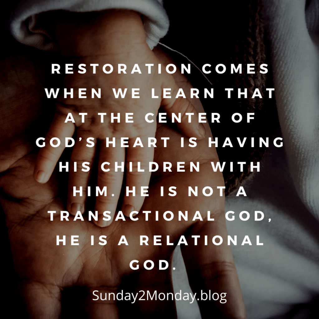 Restoration comes when we learn that at the center of God’s heart is having His children with Him. He is not a transactional God, He is a relational God. He is a God that wants to be with us and out of the love that He has given us we move, go, do, and be his kids on the earth.