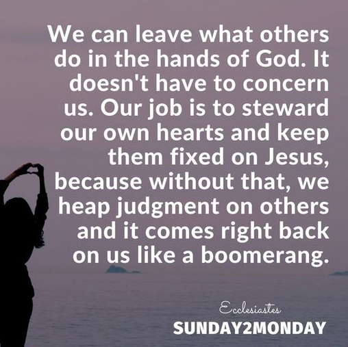 It is a strange thing sometimes to watch people live their lives in opposition to God. It is frustrating (and revealing of our pride) to see people not be punished for their wrong doing. Their wrong doing is sin and our pride is sin. Both may want to decide to be incredibly thankful for the gracious love of God that does not punish us like a lightning bolt from the sky. We can leave what others do in the hands of God. It doesn’t have to concern us. Our job is to steward our own hearts and keep them fixed on Jesus, because without that, we heap judgment on others and it comes right back on us like a boomerang.