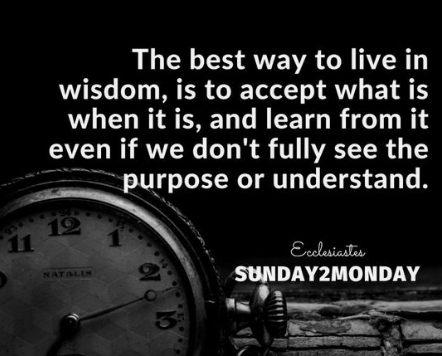 Sometimes the hardest thing to handle is not knowing when it is the right time for things. Under the sun living means a lot of unknown. We know from the third chapter, there is a time and season for everything and we don’t always discern the times correctly. The best way to live in wisdom is to accept what is, when it is, and learn from it even if we don’t fully see the purpose or understand.