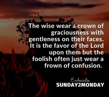 Wisdom and interpretation of it is something we all need. Scripture says to ask the Lord for wisdom who gives it liberally. (James 1:5) These verses from the “preacher” show us that wisdom makes life better and it makes our face shine. The hardness of our face changes. I can imagine that to do foolish things, and to live with the consequences all the time, would cause quite the frustration. However, this verse says that the wise wear a crown of graciousness with gentleness on their faces. It is the favor of the Lord upon them but the foolish often just wear a frown of confusion.