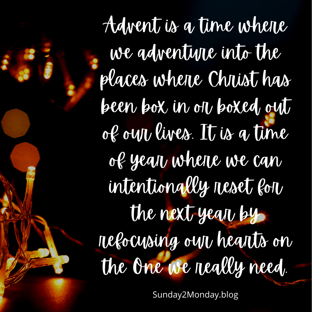 Today, is November 28, 2021. The first day of Advent. Advent is meant to narrow our focus on Christ as we journey toward Christmas Day. The day we celebrate the King has come! Advent is a time where we adventure into the places where Christ has been box in or boxed out of our lives. It is a time of year where we can intentionally reset for the next year by refocusing our hearts on the One we really need. Even the songs we sing declare His coming, His reason for coming, and our great need.