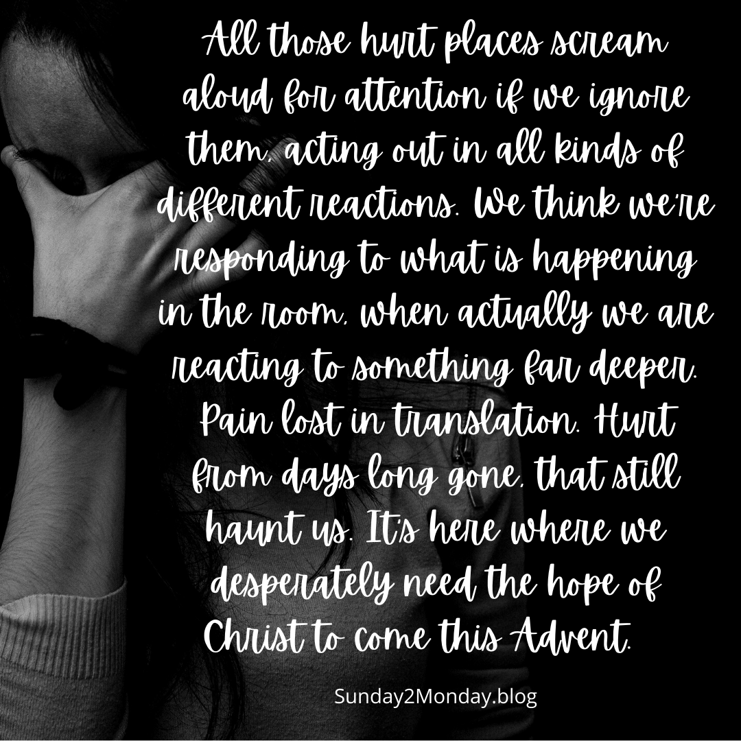 We walk through so many hard things in this life. Most the time it feels like we just have to suck it up and keep moving but is that what Jesus wants for us? Does Jesus want us to pack our hard places and deep hurts away? Just to make do and make it through until some better times come. Maybe we think, “what else are we suppose to do with them?” We’re going in them, through, and out of them but the residue and the impact of them still lives on far after it’s over and often come out sideways in some kind of way. All those hurt places, scream aloud for attention if we ignore them, acting out in all kinds of different reactions. We think we’re responding to what is happening in the room, when actually we are reacting to something far deeper. Pain lost in translation. Hurt from days long gone, that still haunt us. It’s here where we desperately need the hope of Christ to come this Advent.