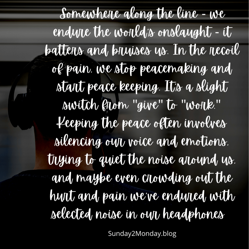 See when we understand what we have been given, how we were those far away and now have been brought near, we receive that peace that Christ gives freely. We become peacemakers. Those who are given the ministry of reconciliation. Those who are helpers in the world to point people to Jesus. But somewhere along the line – we endure the world’s onslaught – it batters and bruises us. In the recoil of pain, we stop peacemaking and start peace keeping. It’s a slight switch from “give” to “work.” Keeping the peace often involves silencing our voice and emotions, trying to quiet the noise around us, and maybe even crowding out the hurt and pain we’ve endured with selected noise in our headphones.