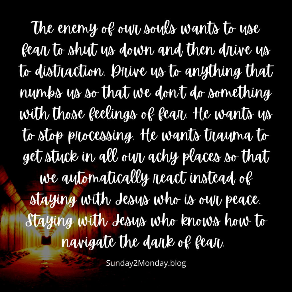 I wrote down this question during Sundays message: What causes your mind to not be stayed on Jesus? Fear! My lifelong rival with fear is two fold. Fearing to speak the truth and fearing what other people will think. Both constantly scrap and gnaw at my soul. Both held me captive for years. Both can’t have me back! I see fear coming a mile away. These last couple of years have been a fight and a half to live in what God says: Do not fear! It’s everywhere: Fear of sickness. Fear of judgment if I don’t do this or I do – do that. Fear of what other people will think. Fear of rejection. Fear of pain. Fear of losing relationship. Fear of death. It has run rampant. The enemy of our souls wants to use fear to shut us down and then drive us to distraction. Drive us to anything that numbs us so that we don’t do something with those feelings of fear. He wants us to stop processing. He wants trauma to get stuck in all our achy places so that we automatically react instead of staying with Jesus who is our peace. Staying with Jesus who knows how to navigate the dark of fear.