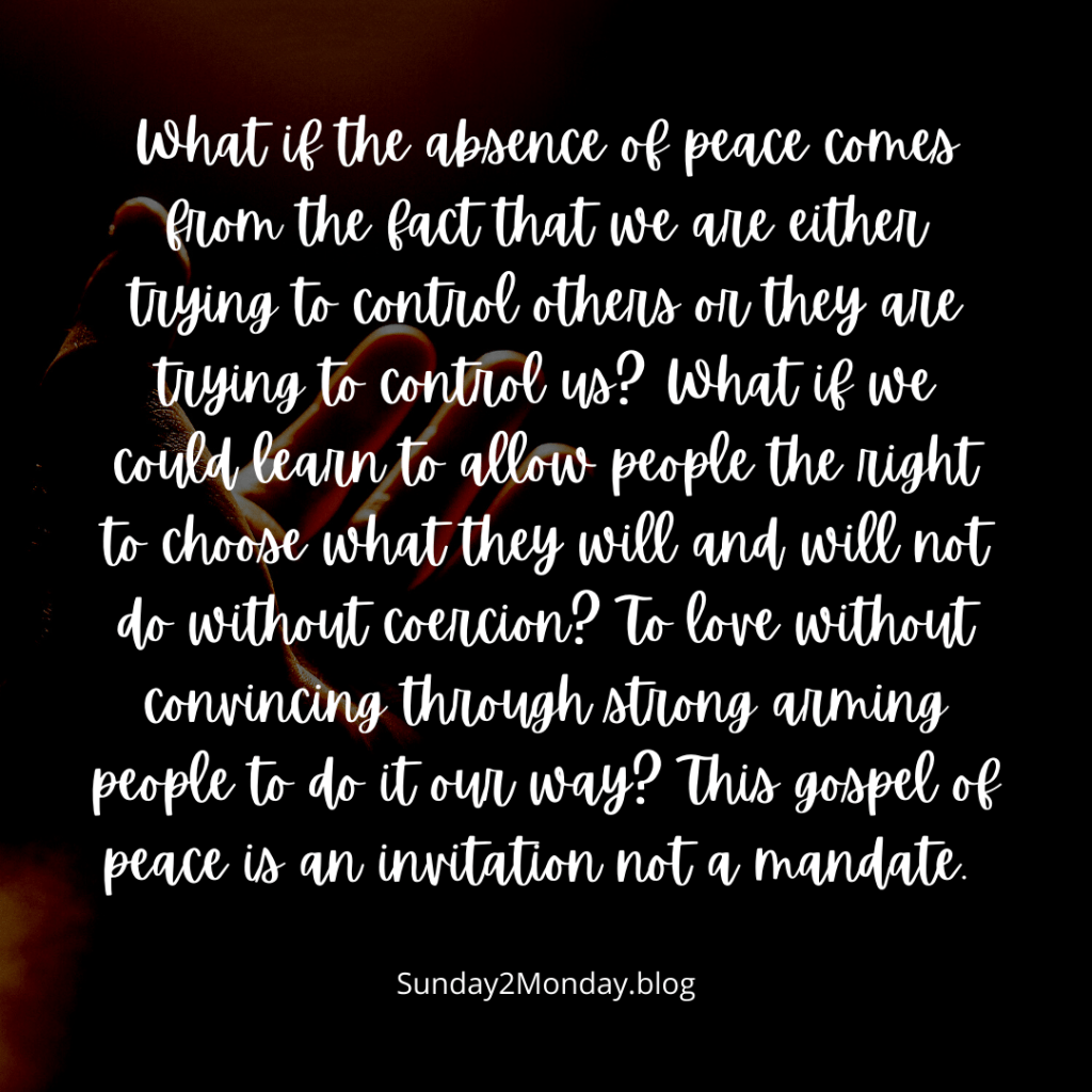 What if the absence of peace comes from the fact that we are either trying to control others or they are trying to control us? What if we could learn to allow people the right to choose what they will and will not do without coercion? To love without convincing through strong arming people to do it our way? This gospel of peace is an invitation not a mandate.