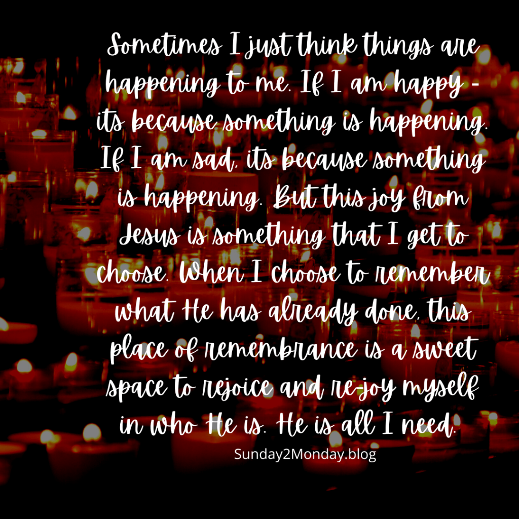 Sometimes I just think things are happening to me. If I am happy – its because something is happening. If I am sad, its because something is happening. But this joy from Jesus is something that I get to choose. When I choose to remember what He has already done, this place of remembrance is a sweet space to rejoice and re-joy myself in who He is. He is all I need.