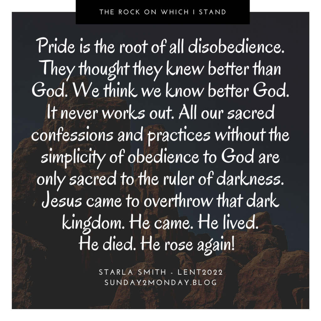 Pride is the root of all disobedience. They thought they knew better than God. We think we know better God. It never works out. All our sacred confessions and practices without the simplicity of obedience to God are only sacred to the ruler of darkness. Jesus came to overthrow that dark kingdom. He came. He lived. He died. He rose again in a body.