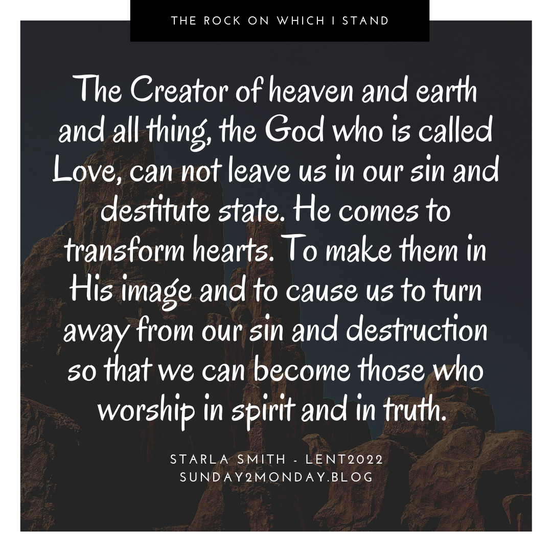 The Creator of heaven and earth and all thing, the God who is called Love, can not leave us in our sin and destitute state. He comes to transform hearts. To make them in His image and to cause us to turn away from our sin and destruction so that we can become those who worship in spirit and in truth.