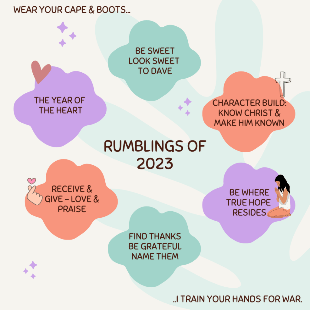 My thoughts Rumblings of 2023 Posted by Starla on January 2, 2023 Not by might, nor by power, but by my Spirit, says the Lord of hosts.Zechariah 4:6 ~ Starla Share this: Click to email a link to a friend (Opens in new window) Email Click to share on Facebook (Opens in new window) Facebook Click to print (Opens in new window) Print Click to share on X (Opens in new window) X Click to share on Pinterest (Opens in new window) Pinterest Like Loading...