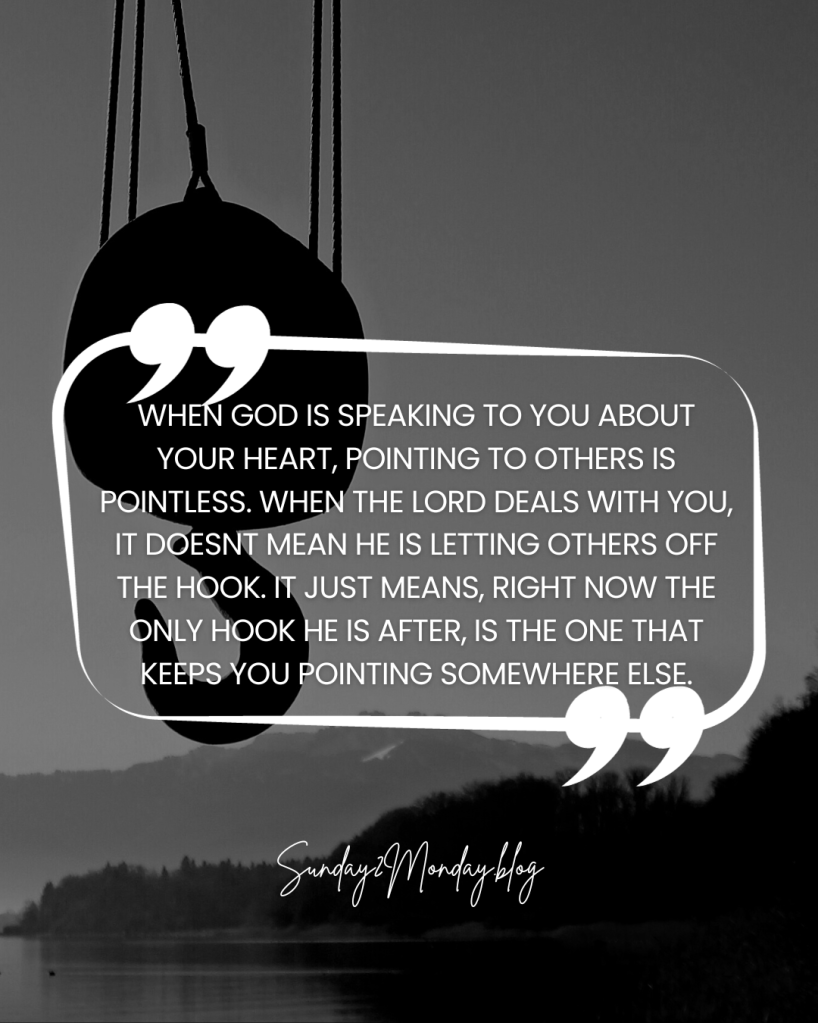 See sometimes there are places where we behave as if we deserve something. Places where we act entitled and if I told you the places and spaces where I do that, you would tell me I have every right. Unless you were on the other end of it. I dont have every right! See, when the Lord walks you into the “dark wilderness” of normal day to day and shows you yourself. Do you argue with Him? I tried. When God is speaking to you about your heart, pointing to others is pointless. When the Lord deals with you, it doesnt mean He is letting others off the hook. It just means, right now the only hook he is after, is the one that keeps you pointing somewhere else.