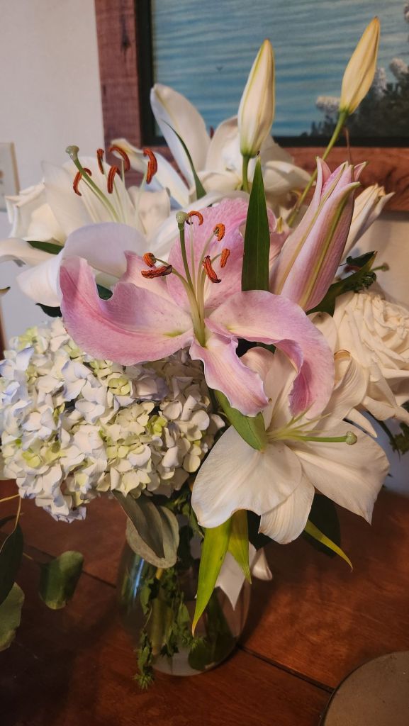 One of the white flowers from my mother in laws memorial service started turning pink. She loved Lillys. She lived on Lillian Lane; her grandmother was Lillian. and her dog is Lily. I think this is just a love note for my husband.