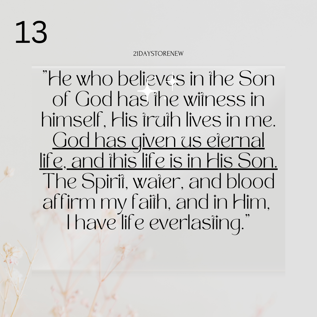 1 John 5:6-13 This is He who came by water and blood—Jesus Christ; not only by water, but by water and blood. And it is the Spirit who bears witness, because the Spirit is truth. 7 For there are three that bear witness in heaven: the Father, the Word, and the Holy Spirit; and these three are one. 8 And there are three that bear witness on earth: the Spirit, the water, and the blood; and these three agree as one. 9 If we receive the witness of men, the witness of God is greater; for this is the witness of God which He has testified of His Son. 10 He who believes in the Son of God has the witness in himself; he who does not believe God has made Him a liar, because he has not believed the testimony that God has given of His Son. 11 And this is the testimony: that God has given us eternal life, and this life is in His Son. 12 He who has the Son has life; he who does not have the Son of God does not have life. 13 These things I have written to you who believe in the name of the Son of God, that you may know that you have eternal life, and that you may continue to believe in the name of the Son of God.