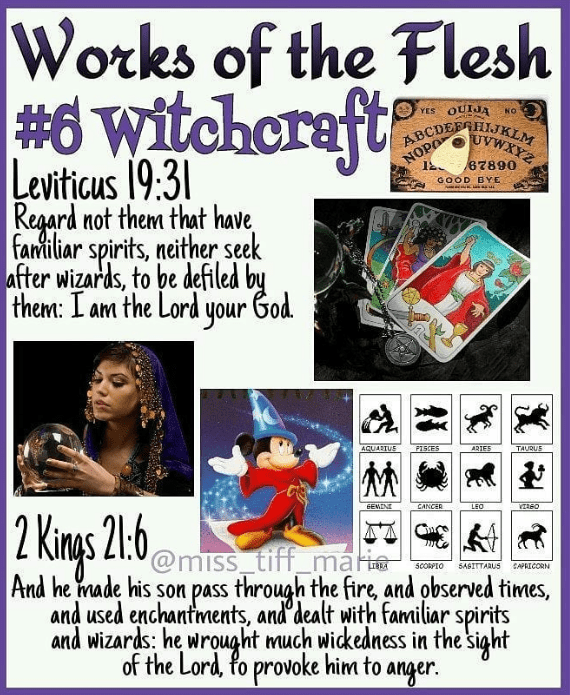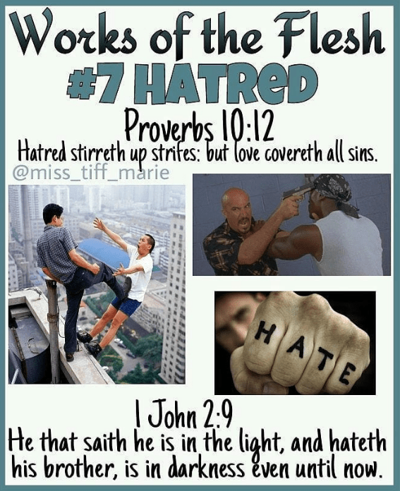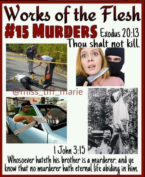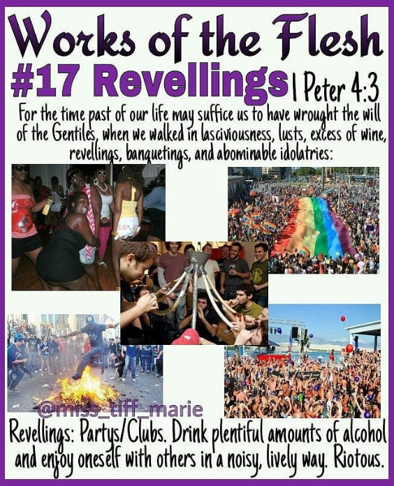 19 Now the works of the flesh are manifest, which are these; Adultery, fornication, uncleanness, lasciviousness,20 Idolatry, witchcraft, hatred, variance, emulations, wrath, strife, seditions, heresies,21 Envyings, murders, drunkenness, revellings, and such like: of the which I tell you before, as I have also told you in time past, that they which do such things shall not inherit the kingdom of God.